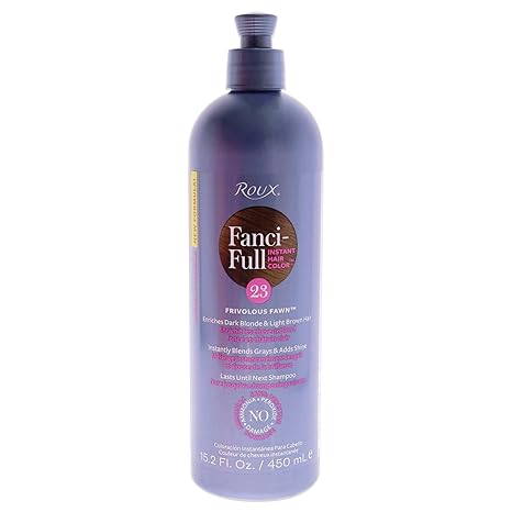 Roux Fanci-Full Instant Hair Color Rinse in 23 Frivolous Fawn offers an easy way to refresh hair color while blending gray strands effectively. This liquid rinse instantly covers grays, delivering a natural look that enhances shine and manageability. It is a trusted choice for those seeking quick color solutions without commitment.